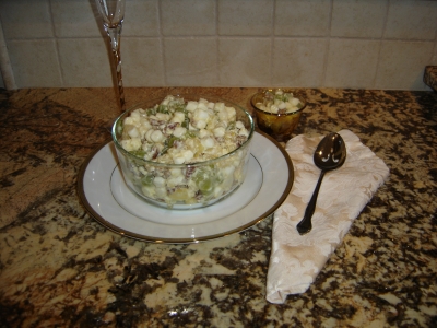 NOTE* I made this great salad last weekend. It is so creamy. The dressing is like lemon pie filling. It soaks into the marshmallows and they are like velvet!